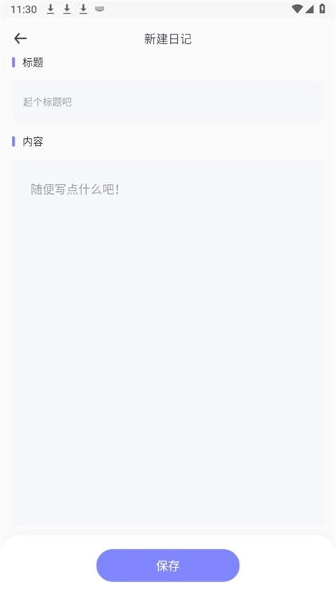 4、在对应的位置,输入日记标题及内容,接着点击保存按钮,操作便完成了。