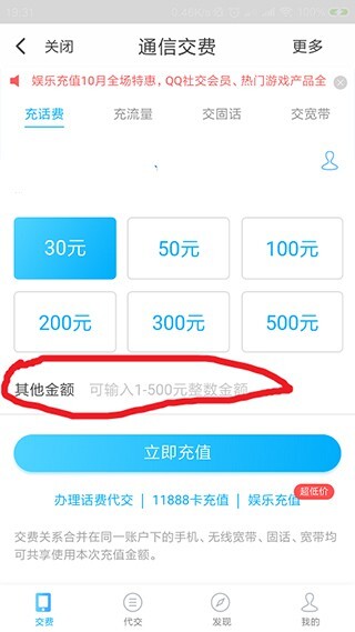 3、进入“充话费”页面,在“其他金额”位置输入你打算充值的金额,接着点击“立即充值”。