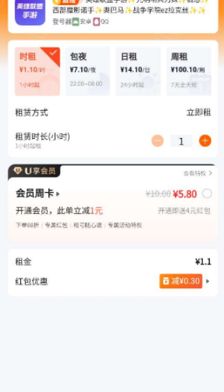 3、会员服务:我们特别推出U享会员。成为U享会员后,能享有订单88%折扣、专属红包以及租赁账户免费退款等诸多特权。