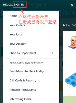 4、同样点击左上角,进入设置页面,点击“SIGN IN”,即可进入账户注册流程。若已有美国亚马逊账户,也可点击此处进行登录。