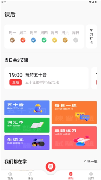 3、在课后界面,呈现出当日的课程安排以及课后练习功能的入口。在这里,用户能够进行学习打卡操作,还可以开展课后练习,如此一来,极大地方便了用户巩固日语知识。