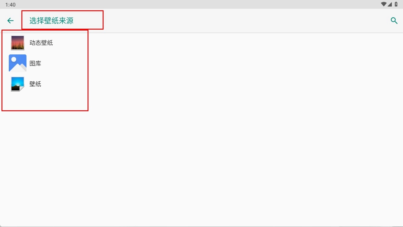 4、点击【壁纸】选项,该选项位于显示设置中,点击后进入【选择壁纸来源】界面,在此界面可选择【动态壁纸】、【图库】、【壁纸】等来源。