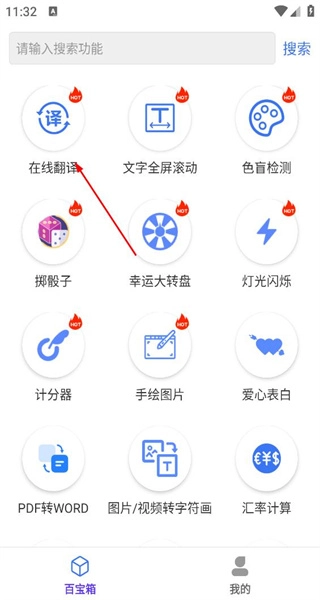 1. 打开软件,随即进入百宝箱界面,此界面呈现出在线翻译、色盲检测等各类功能选项。点击其中的在线翻译,即可进入翻译操作页面。