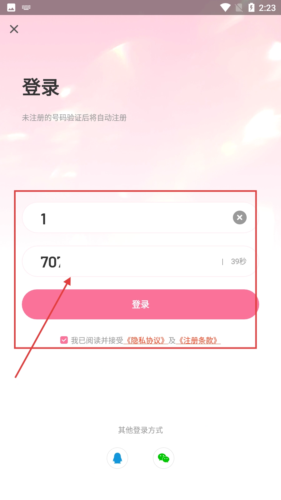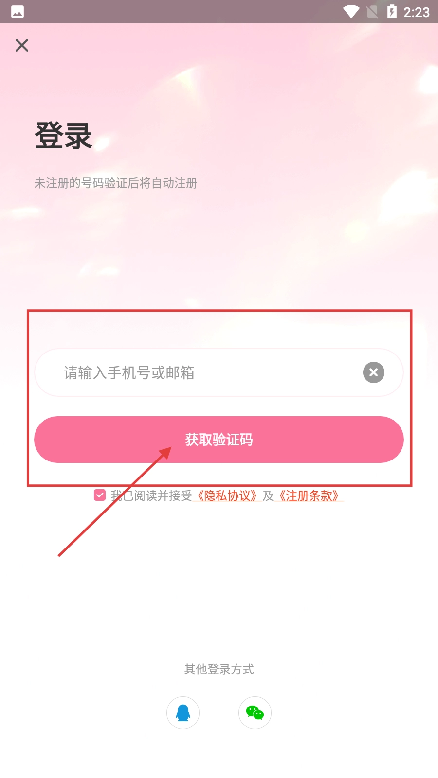 2. 来到登录界面,在“请输入手机号或邮箱”的输入框中填入信息,接着点击“获取验证码”。