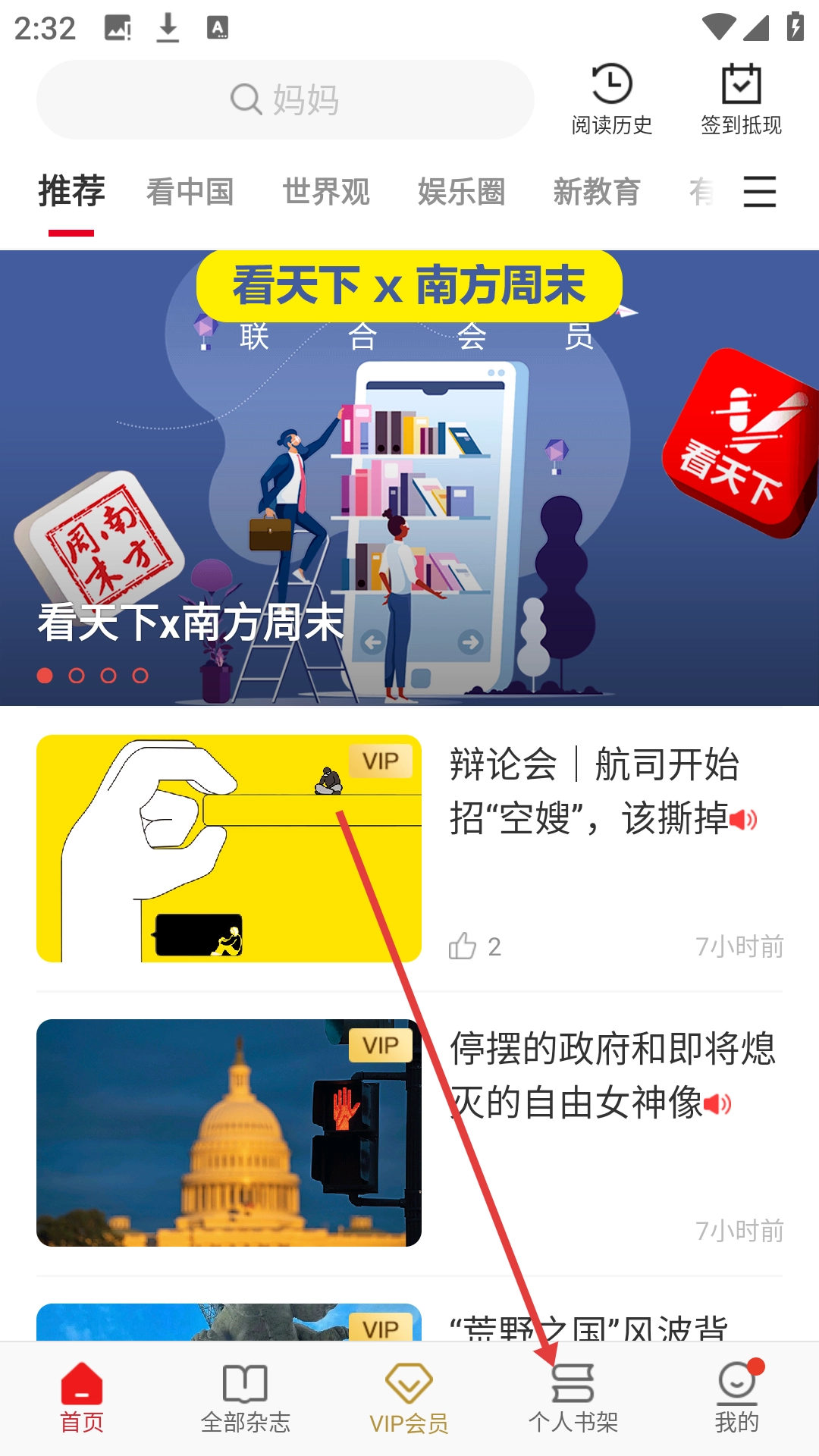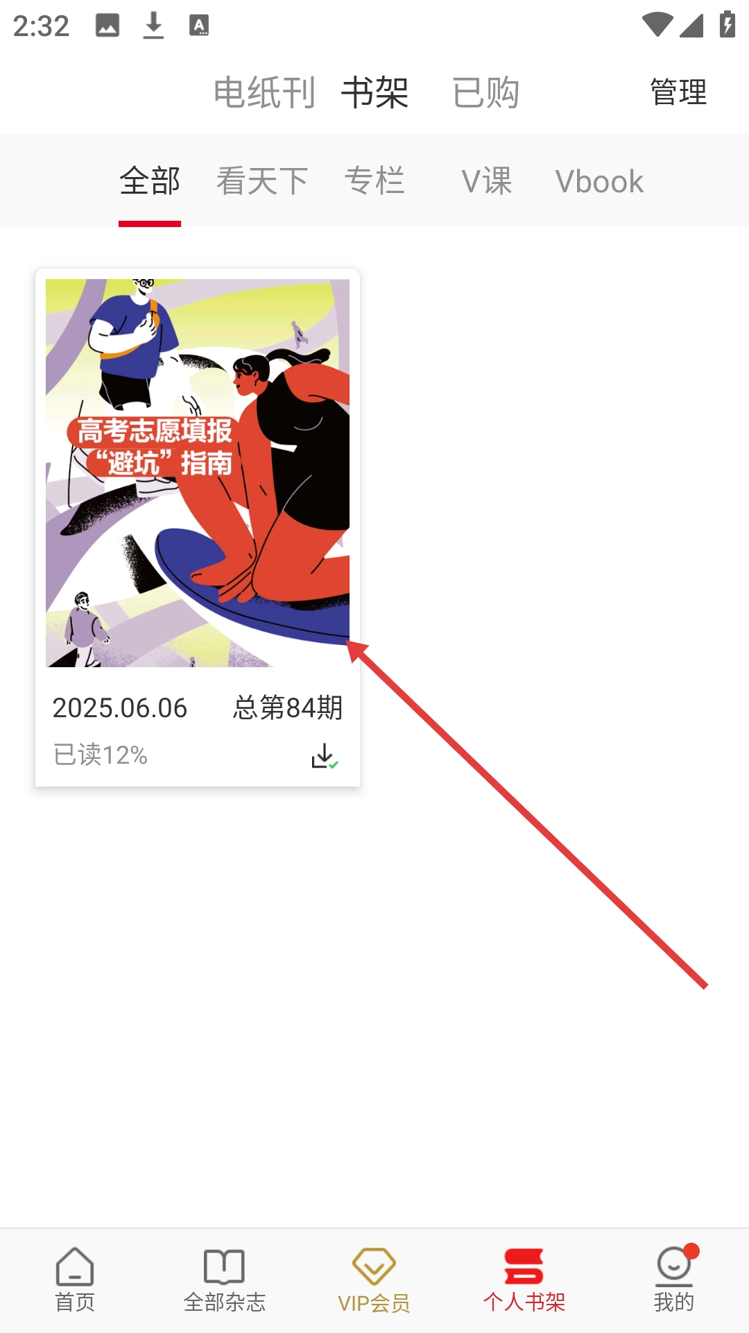 1. 点击【个人书架】,随即进入个人书架页面,在此页面可查看已有的期刊。