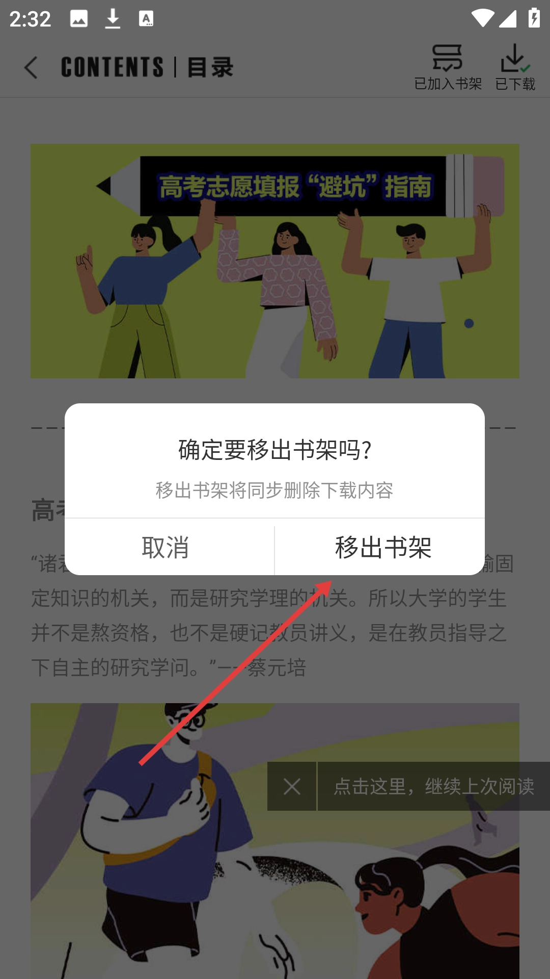 4、于确认框内点击【移出书架】选项,即可把该期刊从书架上移除,同时内容也会同步删除。