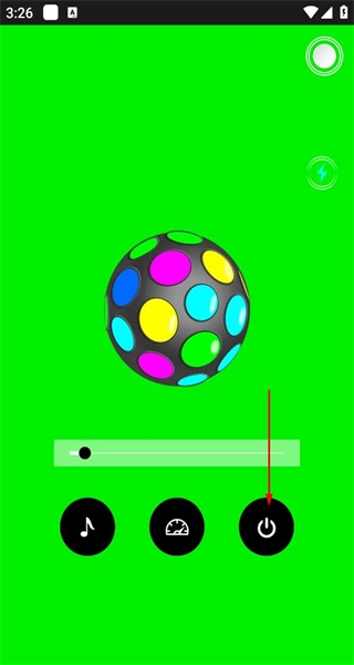 3、回到主界面,此时背景呈现绿色,能看到进度条以及底部按钮,点击电源按钮,对应用的运行状态进行调整。