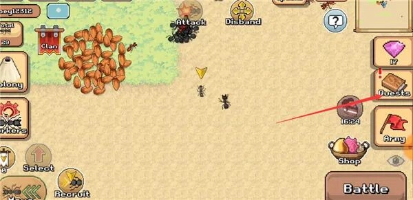 8、移动控制其他的蚂蚁去攻击其他的动物,需点击下方的battle,这里还可以查看血量;
