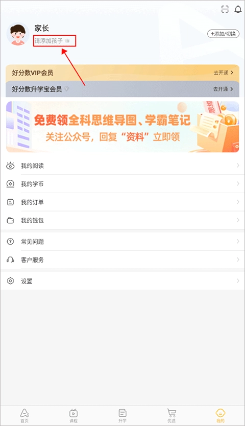 1、首先在好分数学生版我的页面点击头像下方的“请添加孩子”