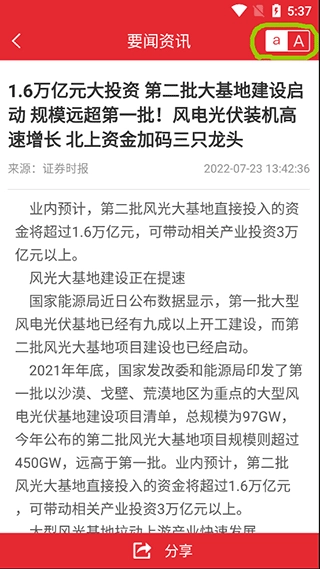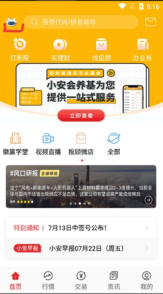 1、打开软件,在资讯界面的找到要闻、风口机会、投顾、股票,这四个资讯都有支持调节字体大小的功能,基本设计在右上角;