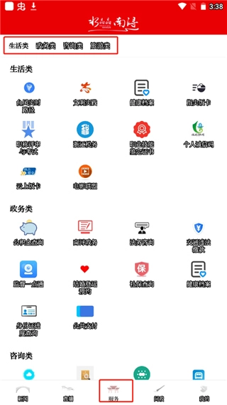 3、点击服务,里面提供生活类、政务类、咨询类、旅游类等等方面的服务;