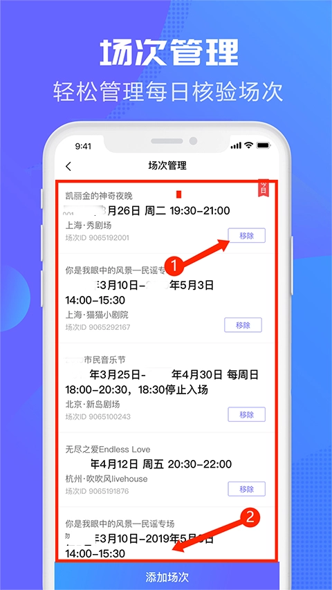 1在【场次管理】页面,能依据不同时段的场次设置,灵活添加或取消专场验票功能,便捷地对每日核验场次进行统筹管理。