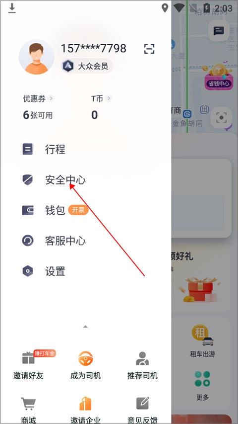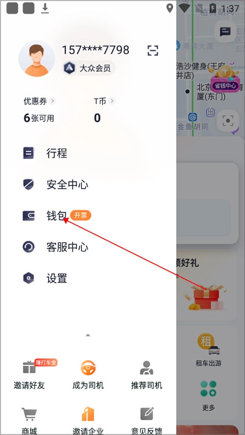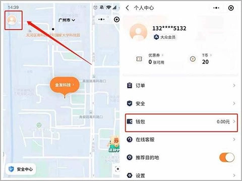 1、打开t3出行或微信小程序,进入主页后点击左上角的“头像图标”。进入个人中心后界面后,点击“钱包”功能;