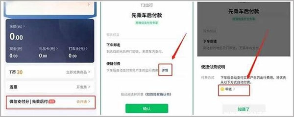 2、进入钱包界面后,点击下方的“先乘后付”功能,进入开通界面后,点击“便捷付费”隔壁的“详情”字样,此时可以选择从零钱自动扣款,还是银行卡;