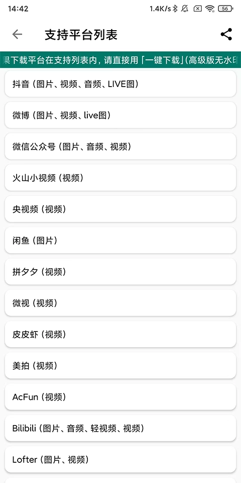 答:便捷的能力一直在更新,从最初支持的微博、微信2个平台已经发展到现在20几个平台了(微博, 绿洲,微信公众号,AcFun,Bilili,火山小视频,皮皮虾,半次元,小红书,央视频,图虫,知乎,头条,QQ音乐,喜马拉雅,网易云,最右,豆瓣,开眼,场库,即刻,QQ看点,酷安,还有神秘世界等), 未来还会继续更新,具体可以在App右上角「支持平台列表」页面查看。