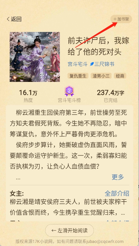 1找到你感兴趣的小说并打开阅读界面后,点击页面右上角的“加入书架”按钮即可完成添加。