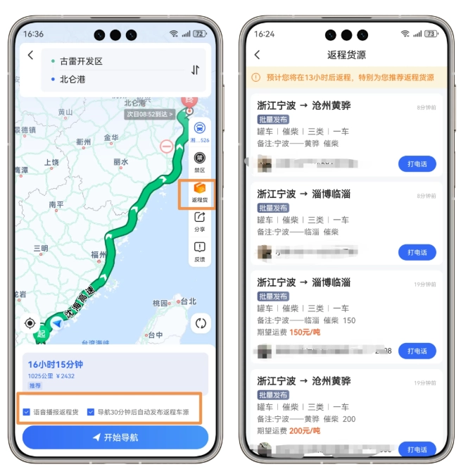 6、导航进行时,可选择返程货推送功能,语音播报货源,可自行设置开关。