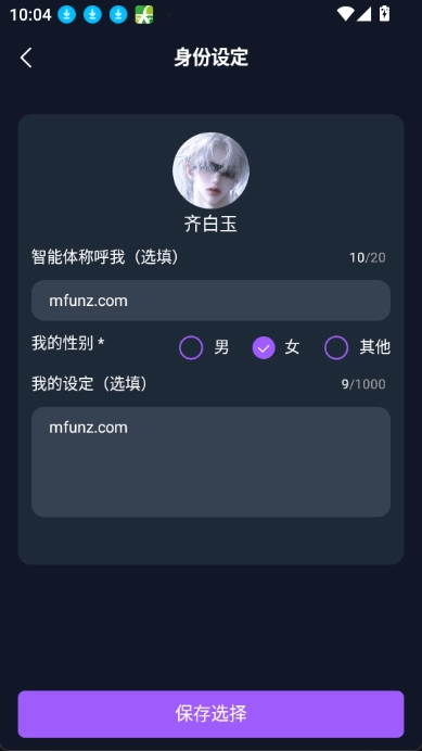 2在弹出的对话框里,你能够设置智能体的性别,以及它在聊天过程中用于称呼自身的名称,这个名称的长度限制为不超过20个字。