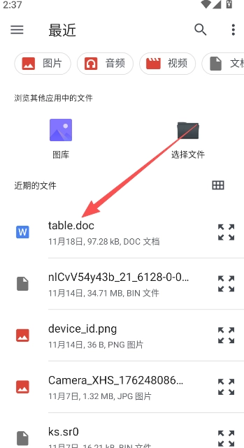 2、选择一个在己目录下存储的文件打开。