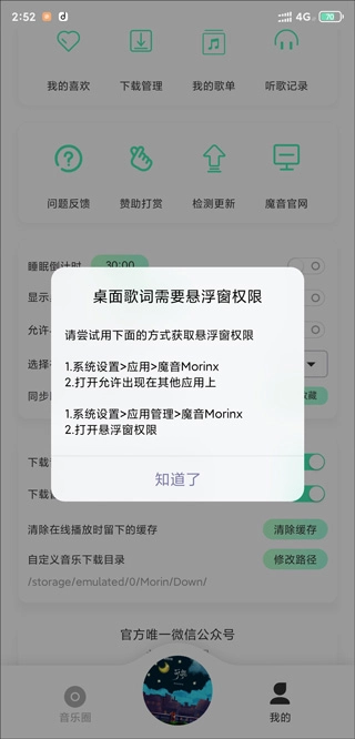 1、魔音morin打开,点击我的,有一个显示桌面歌词的选项