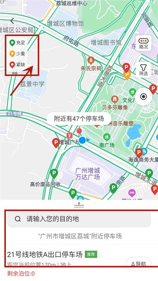 6、左上角会显示当前停车场的车位信息,您也能在下方搜索想去的目的地。