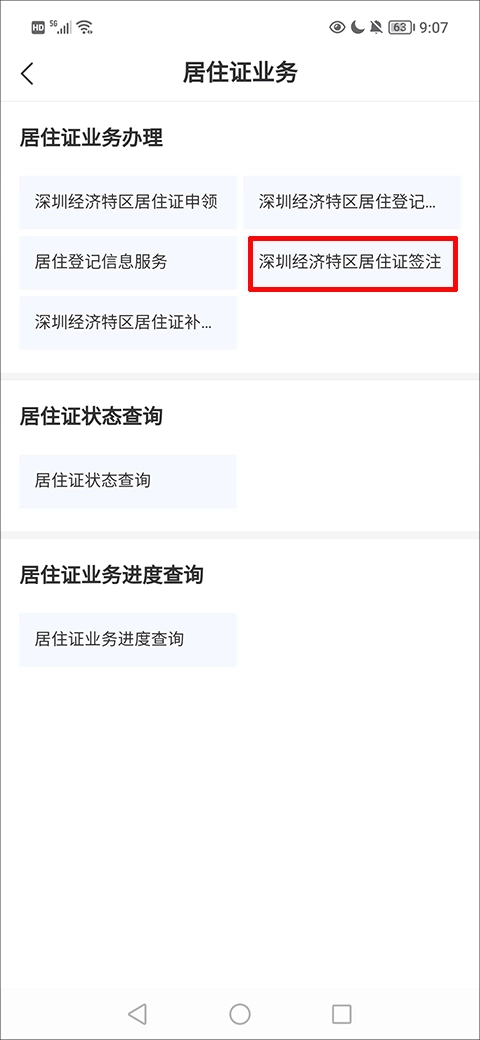 2、在居住证业务界面,找到并点击“深圳经济特区居住证签注”选项;