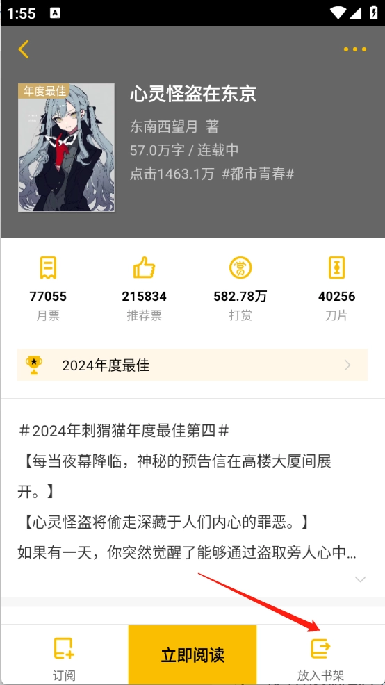 1、找的喜欢的小说或者漫画进入详情页,点击“加入书架”。