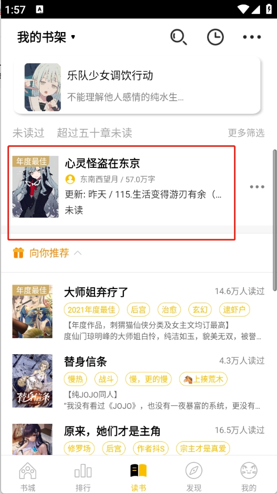 2、回到首页,可以在“读书”页面找到加入书架的内容。