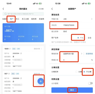 新建商户账号路径:搜电合伙人-首页-我的盟友-商户,点击右下角"+",设置:填写物业的手机号/或者直接用自己的手机号(1个手机号只能开3个商户账号),选择需要开启会员的商铺,设置分成比例为0(如果需要给物业分成,那就按实际的比例填写),分摊方式选择不分摊,点击确认即可。