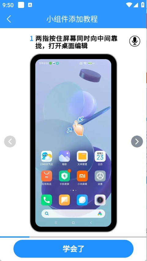 1、两指按住屏幕同时向中间靠拢,打开桌面编辑