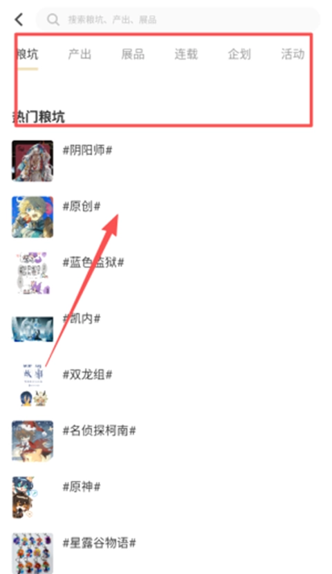 4、在分类筛选部分,还可以找到自己感兴趣的话题加入,比如粮坑、产出、展品、连载、企划以及活动等等。