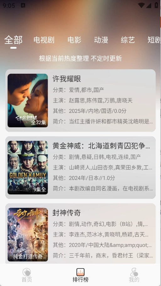 2、排行榜根据当前热度将影视进行了排序。
