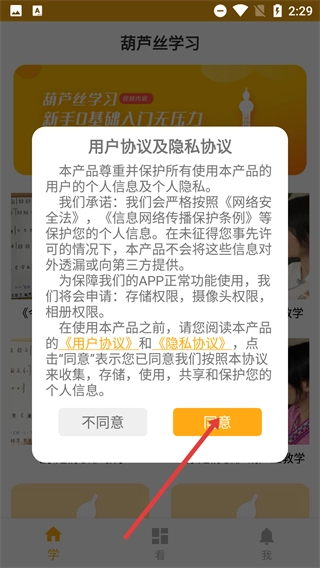 1在开启葫芦丝学习应用时,会弹出包含使用规则与信息保护说明的窗口,仔细了解相关内容后,点击确认按钮即可进入应用使用环节。
