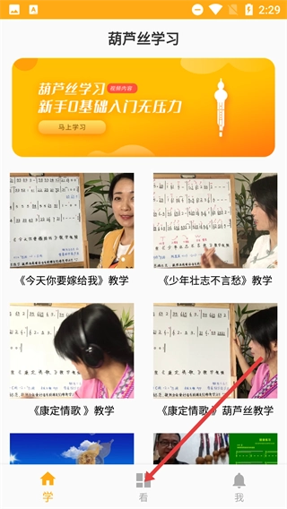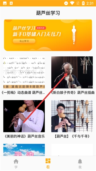 2、在首页,点击底部导航栏中的【看】选项,即可进入葫芦丝相关内容的展示页面。