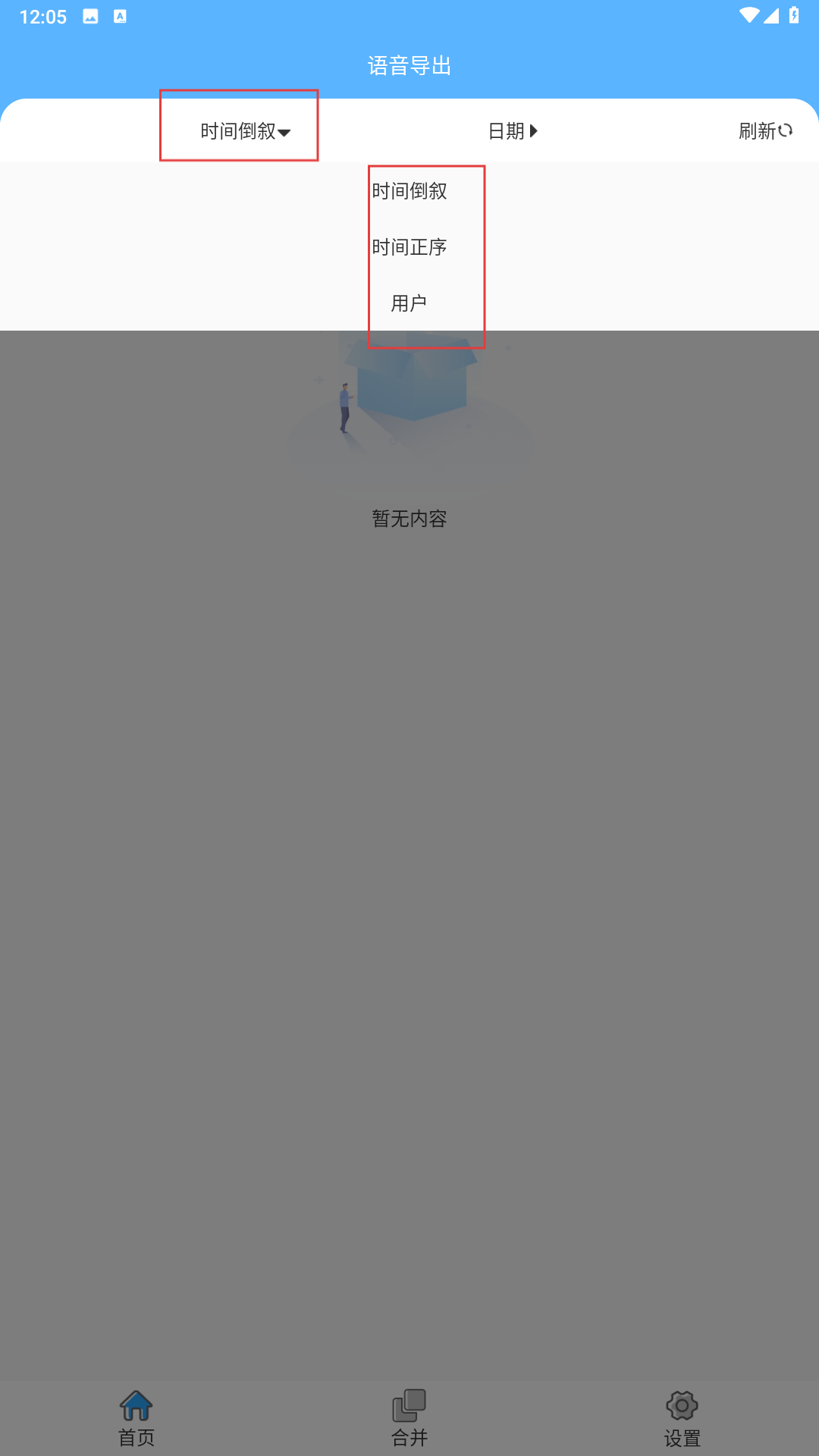 2进入语音导出界面后,点击排序相关的功能按钮,就能在时间倒序、时间正序、按用户等不同排序方式中进行选择。