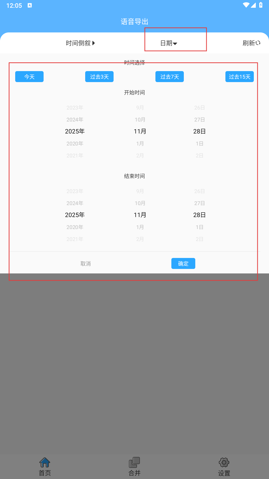3、找到并点击【日期】选项,进入时间选择页面后,可直接选用“今天”“过去3天”这类快捷时间选项,也能自行设定具体的起始与结束时间范围,确认设置无误后点击【确定】按钮,即可完成内容筛选。