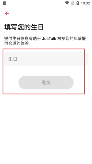 1在填写生日信息的页面完成生日内容的录入后,页面上的“继续”按钮会变为可点击状态,点击该按钮即可进入JusTalk注册流程的下一个环节。