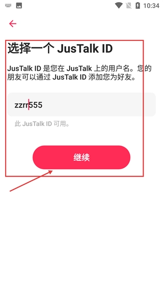 2接下来进入选择专属JusTalk账号标识的界面,先确认你想使用的标识处于可注册状态,再点击确认按钮,这个标识就会成为你在JusTalk平台的个人账号名,后续添加好友时会用到它。
