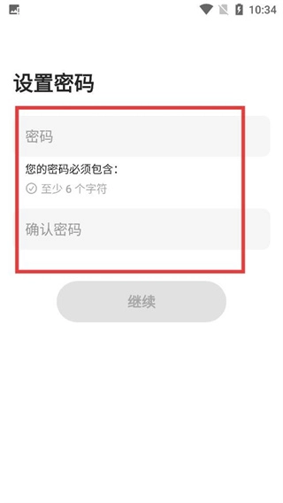 3、进入【设置密码】页面后,要输入不少于6个字符的密码并再次确认,操作完成后点击【继续】按钮,就能完成密码的配置流程。