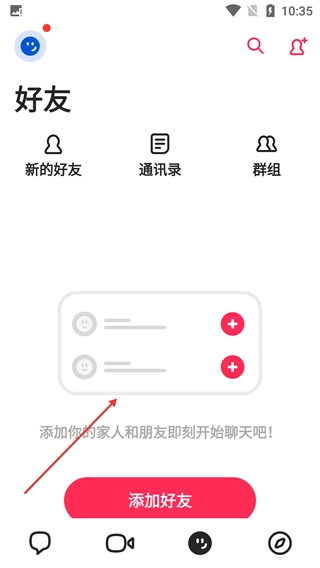 4、进入【好友】页面后,既可以点击【添加好友】按钮来添加联系人,也能够查看【新的好友】【通讯录】【群组】等相关板块,从而开启社交互动。