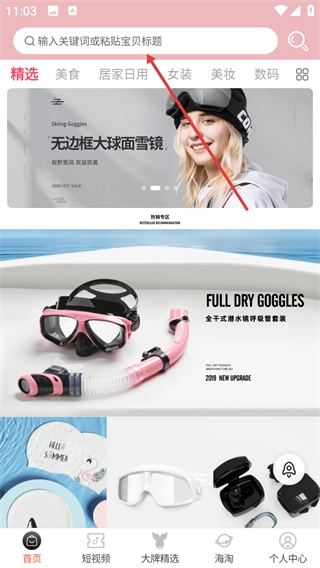 1、在应用首页,点击顶部的【搜索】栏进入搜索界面后,你可以输入关键词,也能粘贴宝贝标题来查找商品。