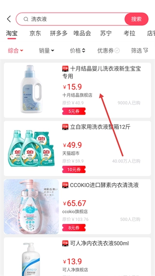 3、在搜索结果页面,挑选目标商品(例如【十月结晶婴儿洗衣液新生宝宝专用】),点击进入该商品的详情页面。