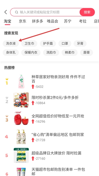 2在搜索页面,能挑选【搜索推荐】里的相关词(比如【洗衣液】)来迅速启动搜索,还可以切换不同的平台分类标签。