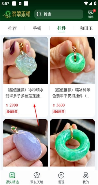 3、切换至挂件分类,进入相应页面,浏览翡翠挂件的款式,知晓其价格及推荐信息。