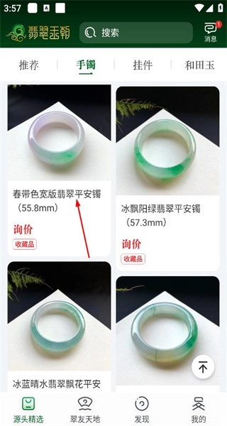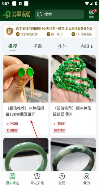 1启动对应应用后进入首页推荐板块,浏览陈列的翡翠类首饰,同时留意其定价及平台标注的推荐相关信息。