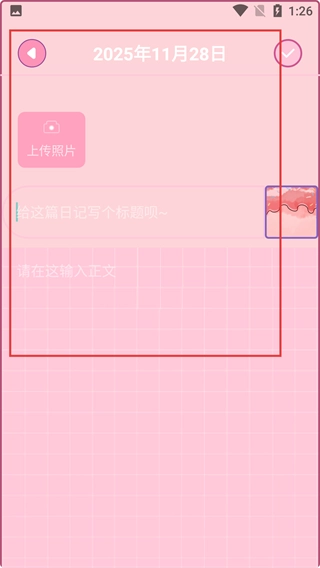 2进入编辑页面后,系统会默认选中当前日期(例如2025年11月28日),你可以点击【上传照片】按钮添加配图,同时也能填写标题和正文内容。