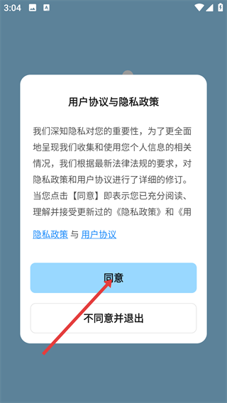 1在用户协议和隐私政策的弹窗里,仔细阅读条款内容后,点击【同意】按钮,就能继续进行应用的后续操作流程。