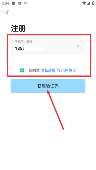 3在账户注册的界面,输入用于验证的手机号或邮箱地址,同时确认已勾选同意相关的隐私政策与用户使用条款,随后点击获取验证码的功能按钮,以获取完成注册流程所需的验证信息。