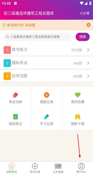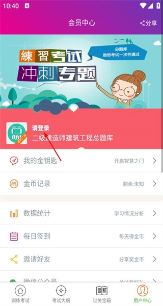 1打开软件后,先进入训练考试页面,接着找到用户中心选项,点击该选项即可进入会员中心。