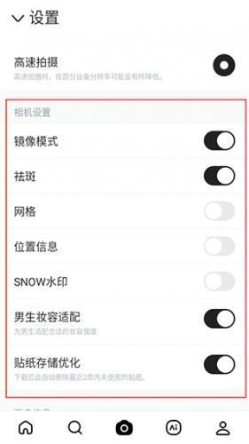 4、在设置界面,可以关闭位置信息,水印等不常用功能,开启祛斑、网格、男生妆容适配等常用功能
